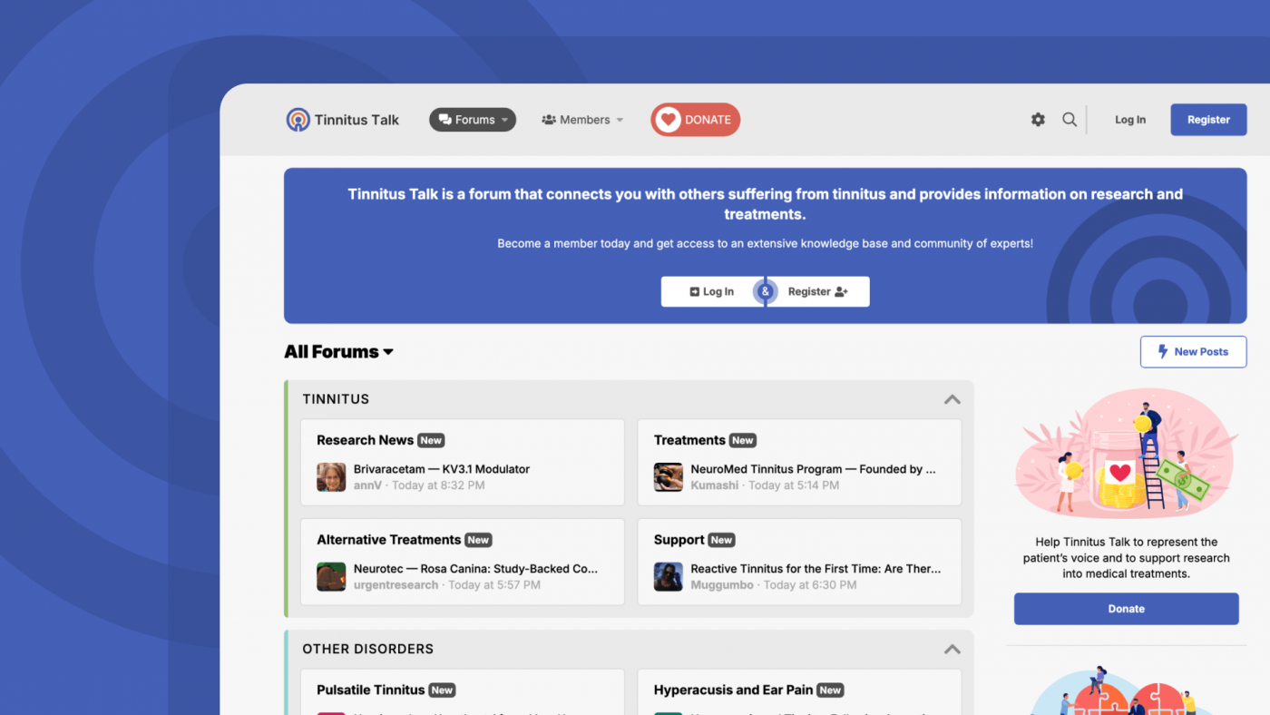 Tinnitus Talk is a community of 40k+ users where awareness can be raised about tinnitus, those with tinnitus can get support, and patients can be connected with researchers. Started in 2011, over 600k+ messages have been shared on the site between users and experts about experiences, research, and how to support the cause.